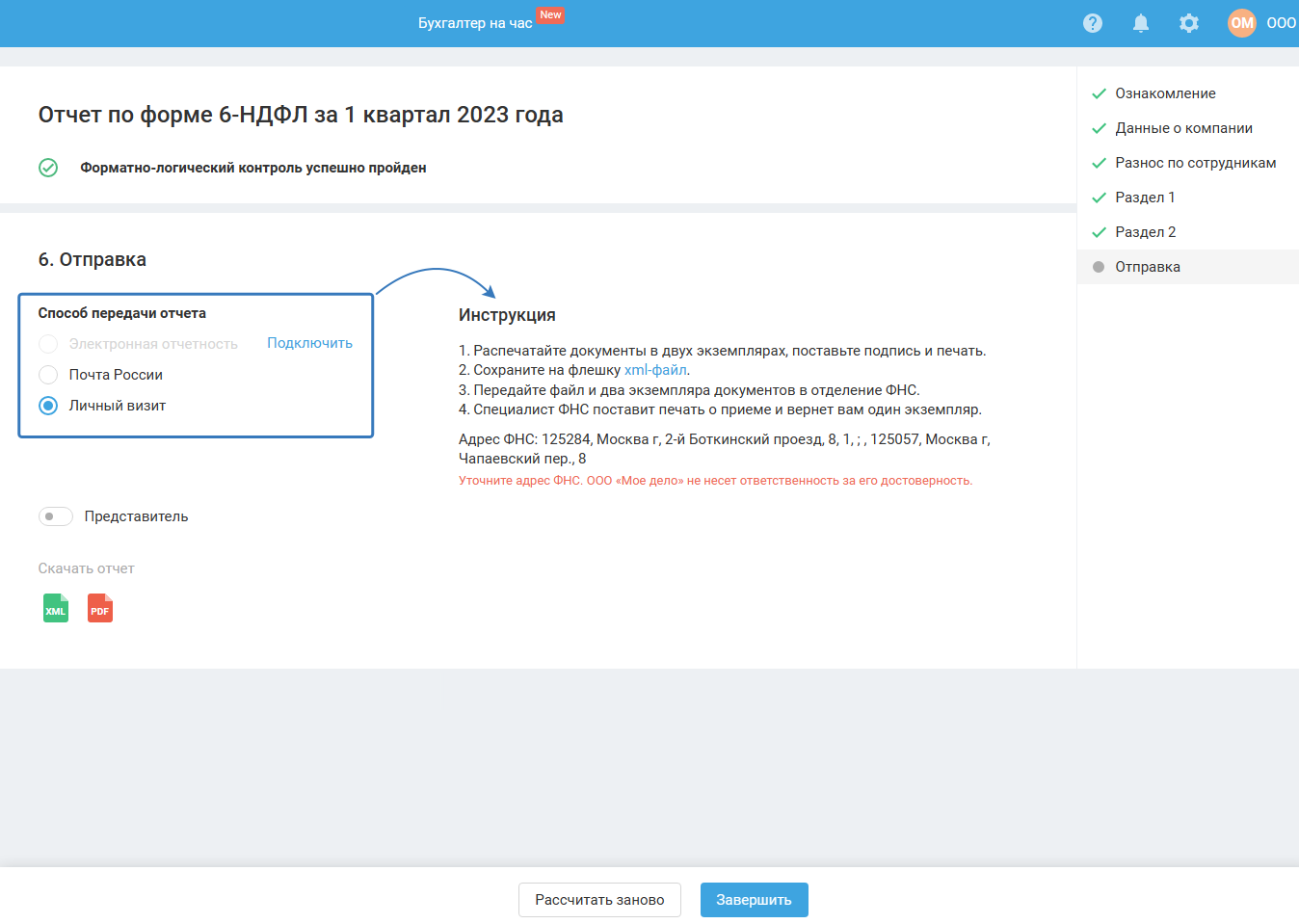 Пройдите отчёт до конца, нажимая кнопку «Далее» на каждом этапе. На шаге «Отправка» нажмите «Завершить» и подтвердите отправку отчёта.