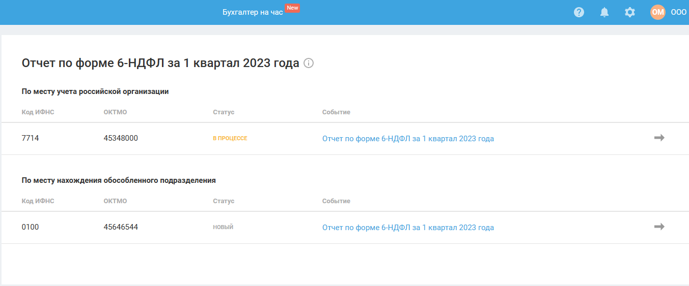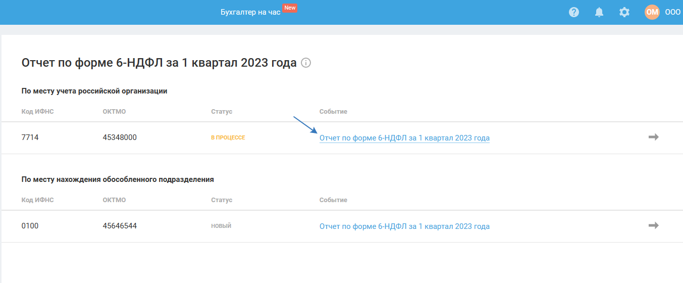 Для формирования отчёта в другую налоговую вернитесь на главную страницу, в Календаре событий выберите событие по формированию 6-НДФЛ за нужный период.