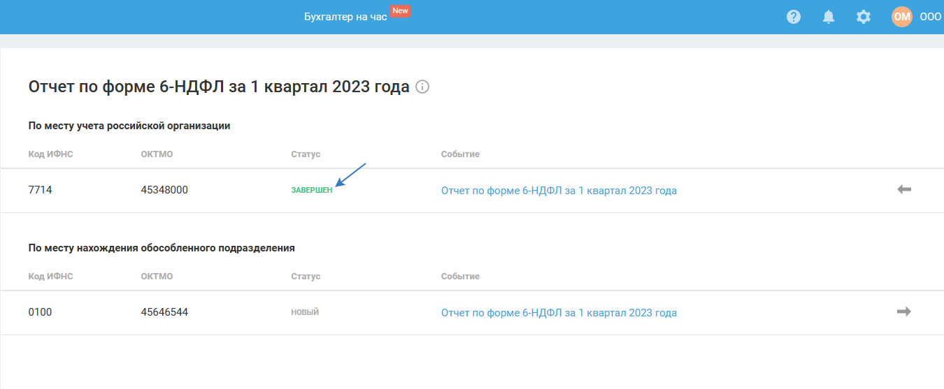 На странице списка отчётов 6-НДФЛ статус отчёта будет изменён на «Завершён»: