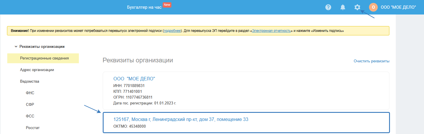 После того как отчёт по старому ОКТМО подготовлен, перейдите в раздел «Реквизиты» и нажмите на блок с адресом организации:
