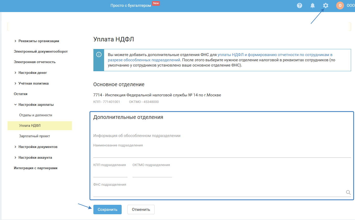 1. Нажмите на значок шестеренки, перейдите в раздел «Настройки зарплаты», выберите подраздел «Уплата НДФЛ» и нажмите «+ Добавить отделение».