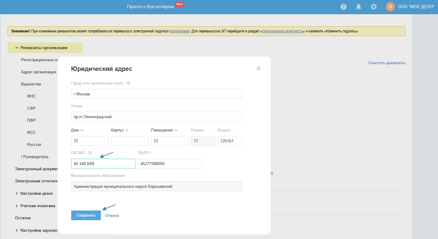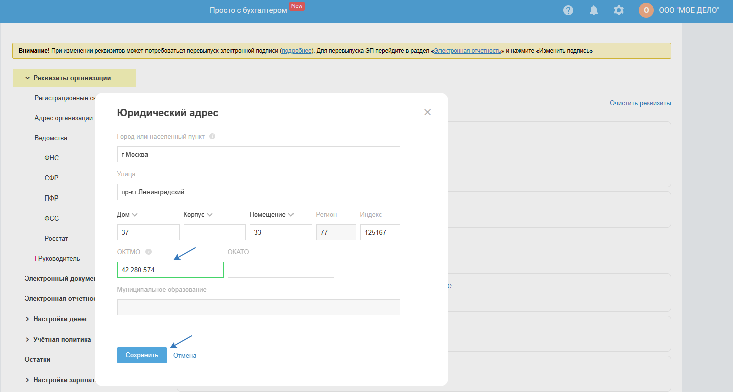 В открывшемся окне в поле ОКТМО укажите новый ОКТМО, нажмите на кнопку «Сохранить»: