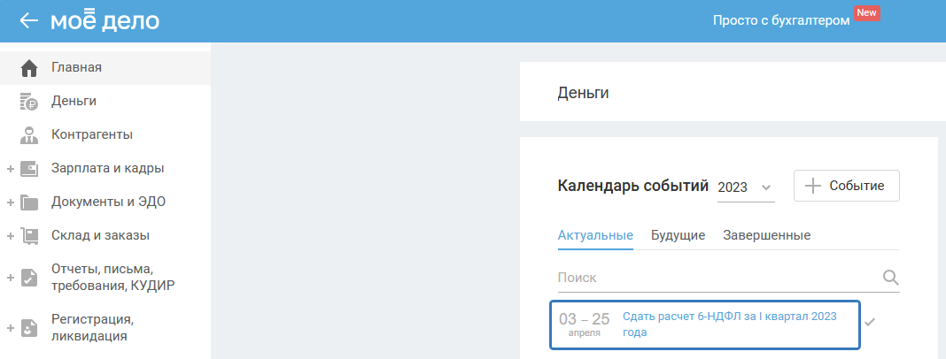 3. Для формирования отчёта перейдите в Календарь событий и выберите «Сдать расчёт 6-НДФЛ за ...»: