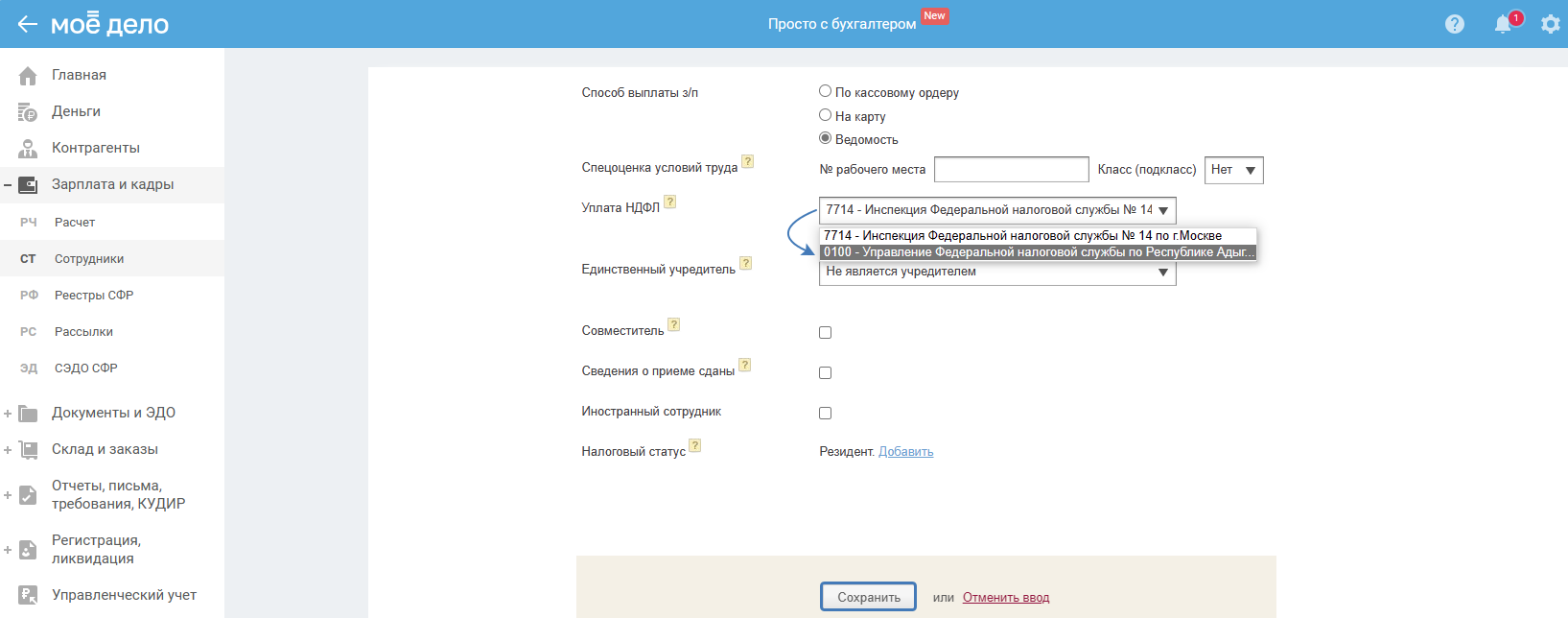 2. В реквизитах сотрудника в поле «Уплата НДФЛ» выберите из выпадающего списка налоговую, в которую вы будете платить НДФЛ с доходов сотрудника и сдавать отчёт 6-НДФЛ: