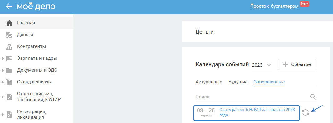 После чего перейдите в мастер формирования отчёта 6-НДФЛ во вкладке «Завершённые» в Календаре событий: