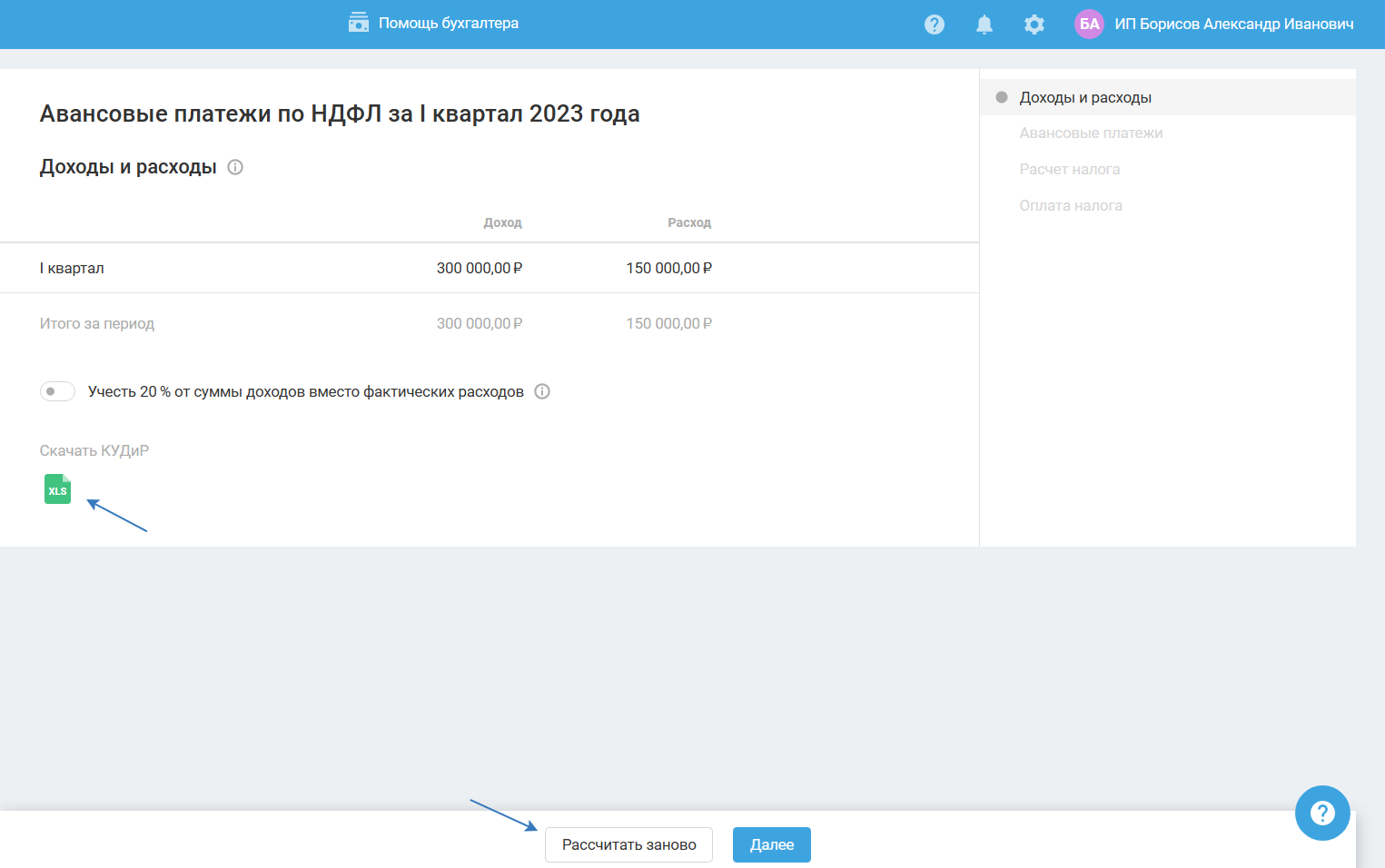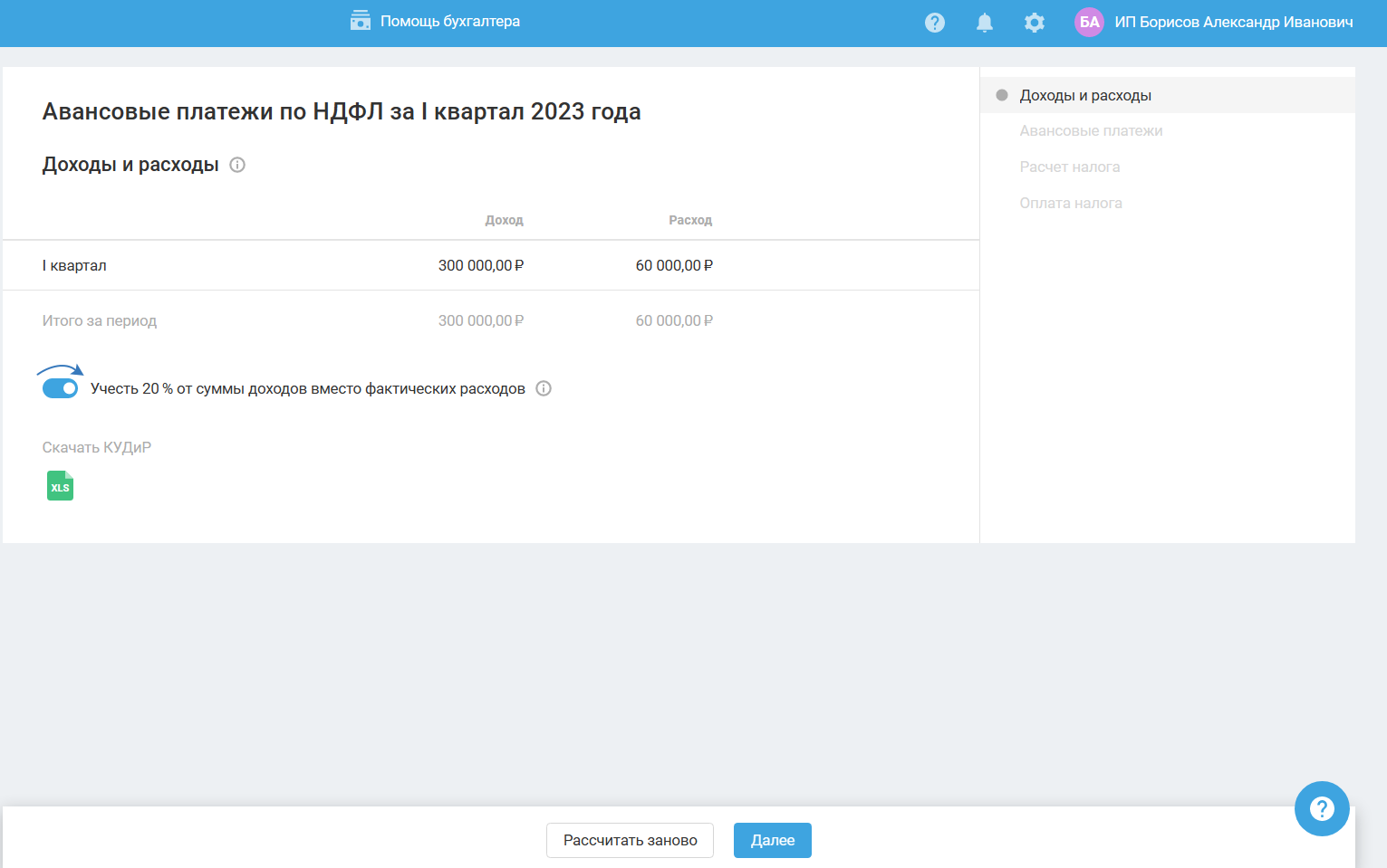 Данные этого шага формируются на основании книги учёта доходов и расходов (КУДиР). КУДиР можете скачать в формате xls, нажав на иконку.