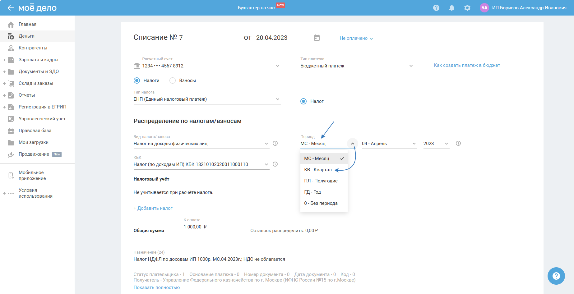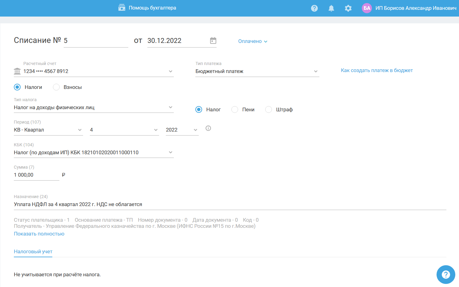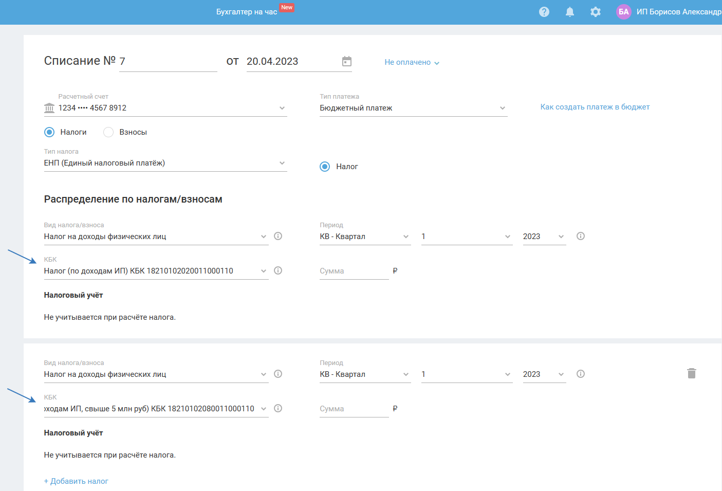 - КБК выбран с типом «Налог (по доходам ИП)» для ставки 13% (налогооблагаемая база до 5 млн.) или с типом «НДФЛ (нал. агент/по доходам ИП, свыше 5 млн руб)» для ставки 15% (налогооблагаемая база свыше 5 млн.).