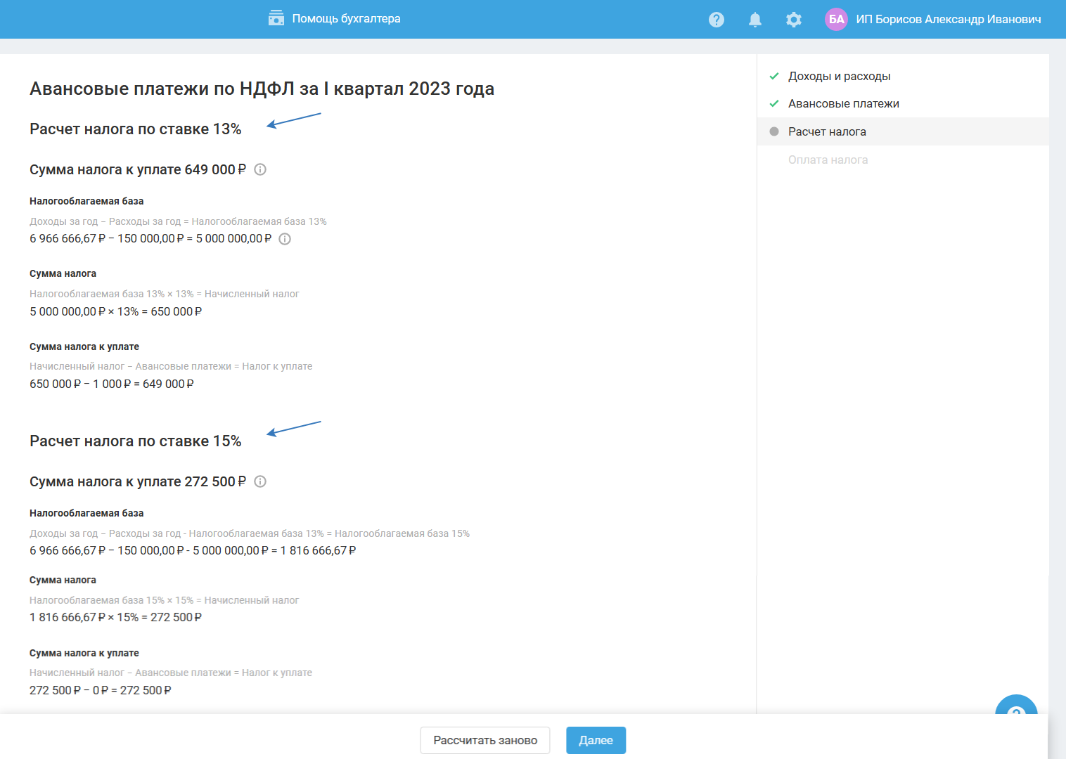Если налогооблагаемая база (считается как разность доходов и расходов за год) не превысила 5 млн, то расчёт производится по ставке 13%. А если превысила 5 млн, то расчёт производится по двум ставкам: 13% (до 5 млн) и 15% (всё, что свыше 5 млн).