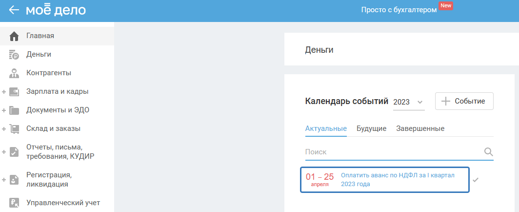Для того чтобы оплатить аванс по НДФЛ, перейдите в Календарь событий на главной странице и нажмите на событие: