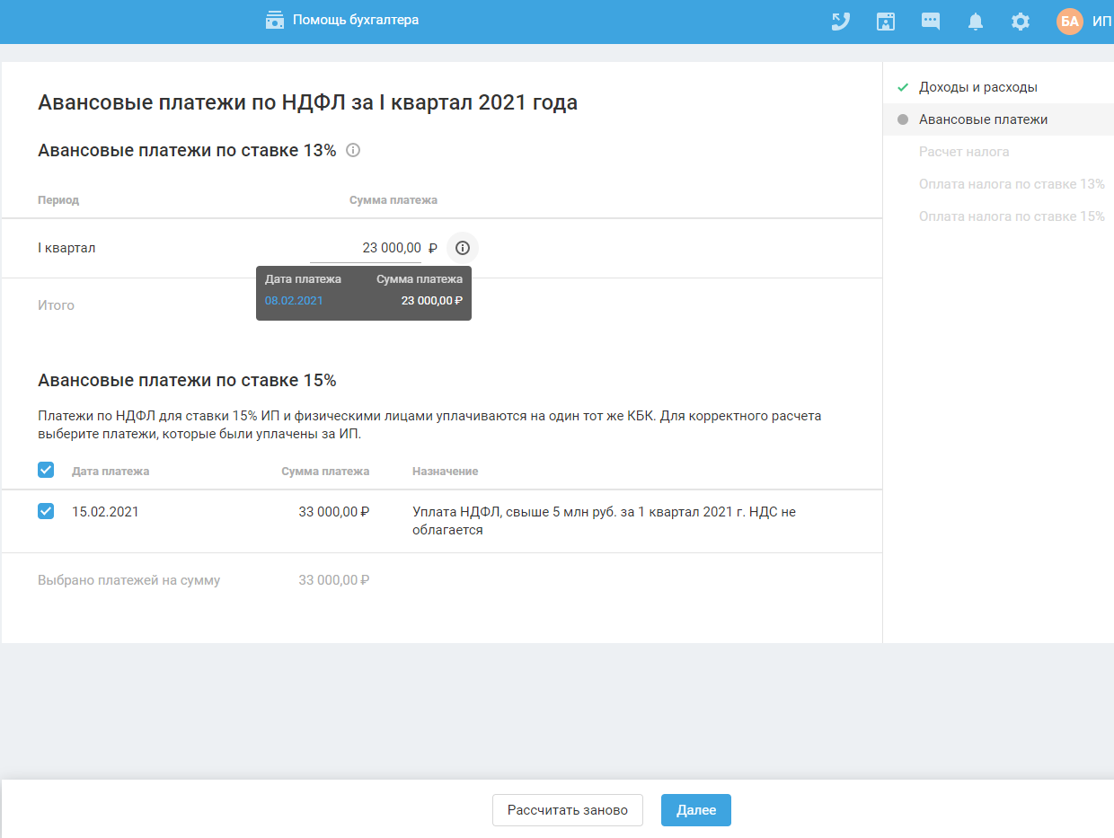 Платежи по НДФЛ для ставки 15% и физическими лицами уплачиваются на один и тот же КБК. Выберите платежи, которые были уплачены за ИП, для корректного расчёта.