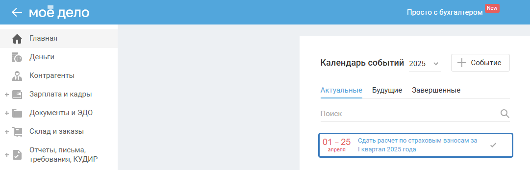 Для формирования отчёта перейдите в Календарь событий на главной странице и выберите «Расчёт по страховым взносам за ...».