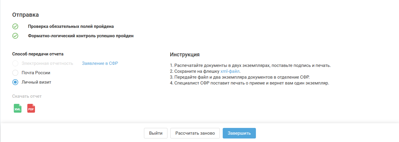 Если ФЛК (форматно-логический контроль) пройден, выберите способ отправки отчёта и подтвердите отправку.