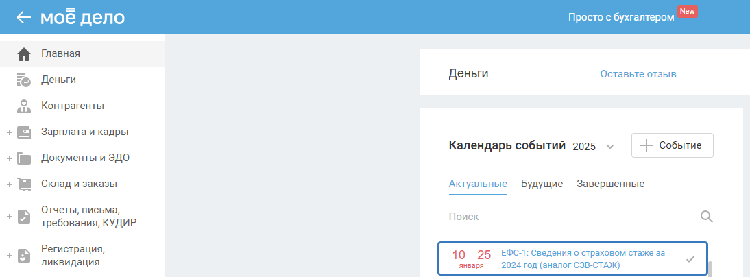На главной странице в виджете «Календарь событий» выберите событие «ЕФС-1: Сведения о страховом стаже за __ г.»: