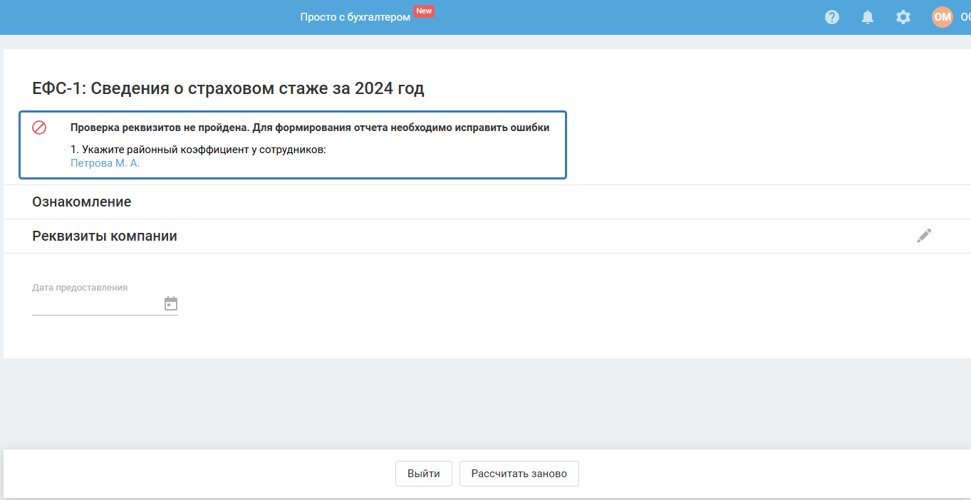 Если у сотрудника указан код территориальных условий, то обязательно должен быть заполнен районный коэффициент. В случае незаполненных данных отчёт не пройдёт проверку и укажет соответствующую ошибку: