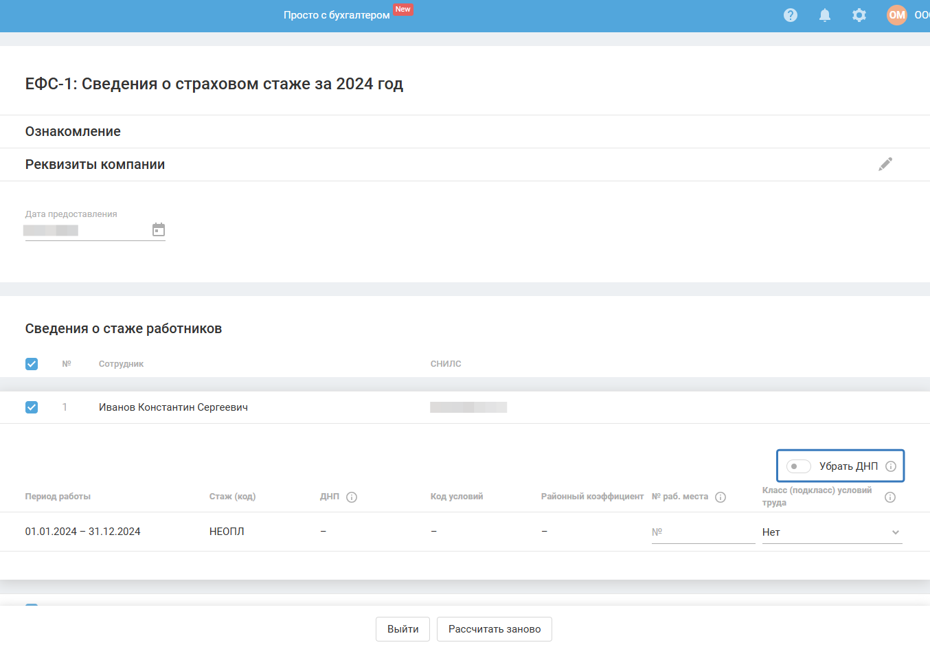 При включении настройки «Убрать ДНП» (Убрать Досрочное назначение пенсии) страховой стаж будет отражён без условий досрочного назначения пенсии.