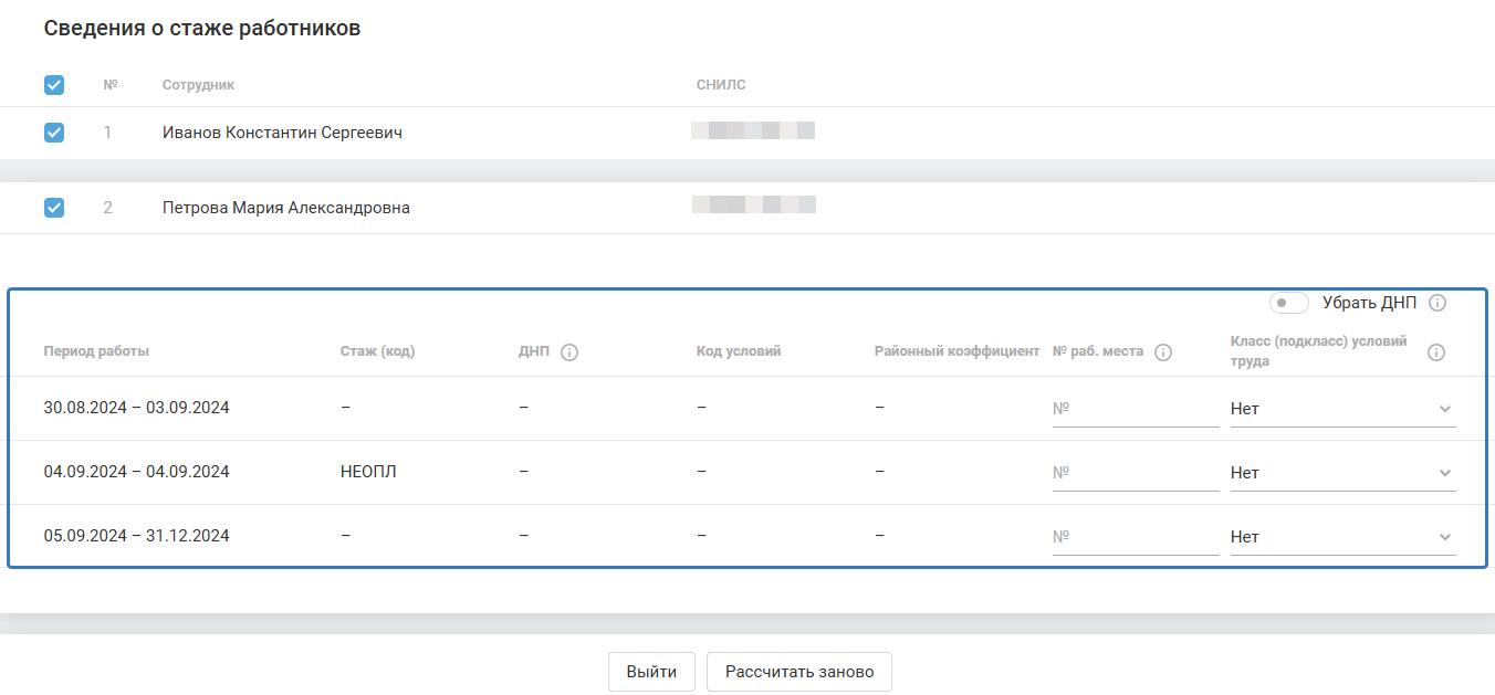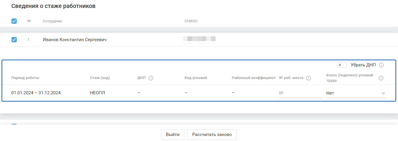 При включении тумблера со всех стажевых периодов сотрудника убирается заполнение блока ДНП (информация представлена ниже).