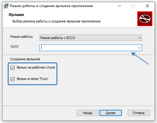 7. Выбор режима работы и создание ярлыков приложения. В поле «Режим работы» укажите «Режим работы с ECCO» и ваш территориальный орган гос. статистики в строке «ТОГС».