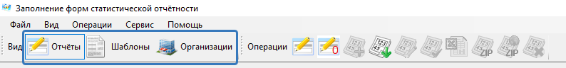 В верхней части находится главное меню, кнопки работы с Отчётами, Шаблонами, Организациям. В средней части окна будет отображаться список отчётов, шаблонов или организаций, в зависимости от выбранного пункта меню.