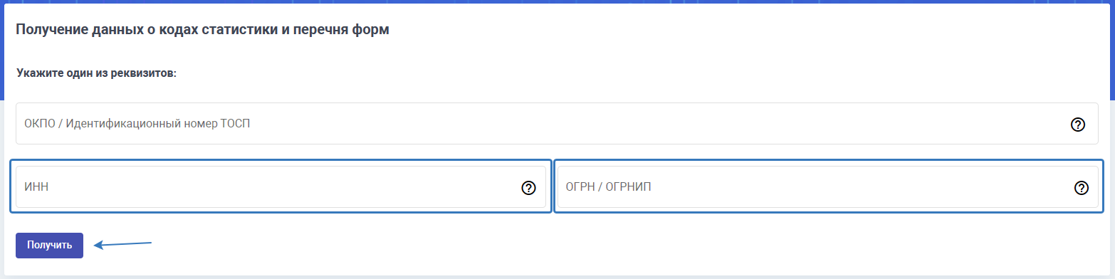 Формы статистической отчётности представляют собой файлы с расширением *.xml. Чтобы загрузить XML-шаблоны за нужный год, перейдите по ссылке https://websbor.gks.ru/online/info и укажите ИНН или ОГРН/ОГРНИП, нажмите на кнопку «Получить»: