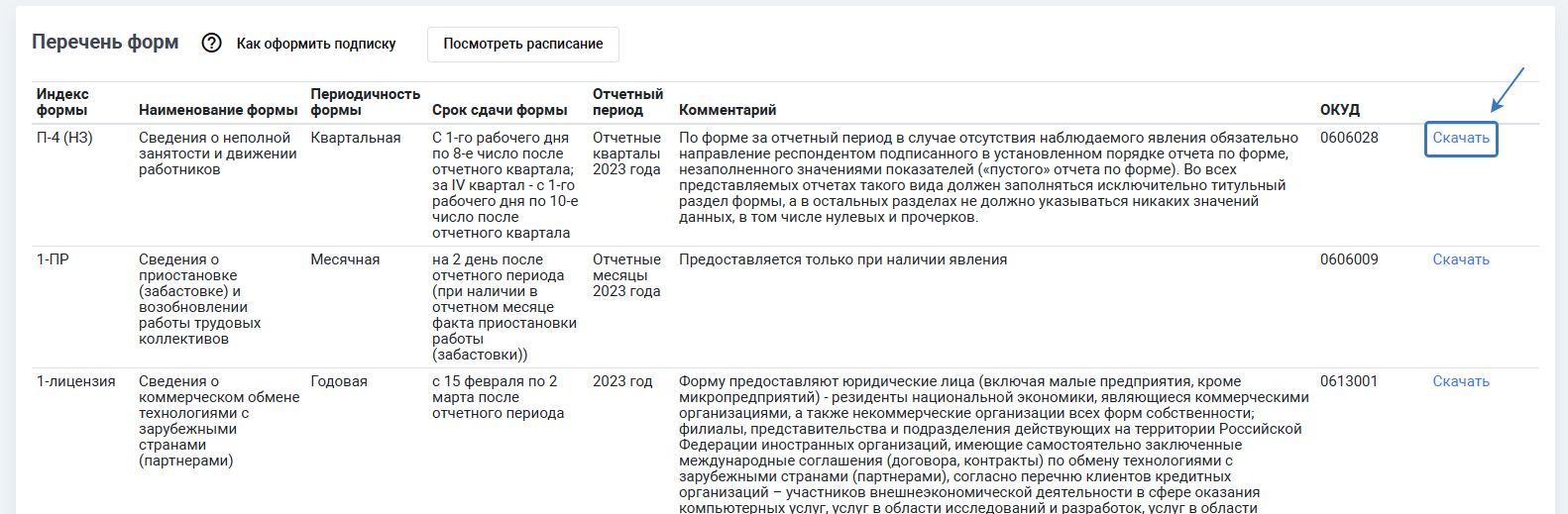 В списке шаблонов внизу страницы найдите нужную форму и нажмите на ссылку «Скачать» по колонке XML-шаблона.
