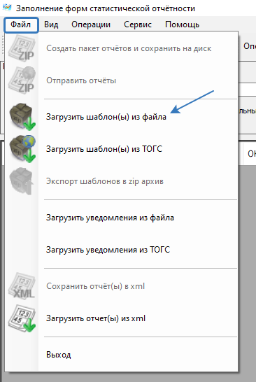 После этого вернитесь в программу «Заполнение форм статистической отчётности» и выберите пункт меню «Файл — Загрузить шаблон(ы) из файла»: