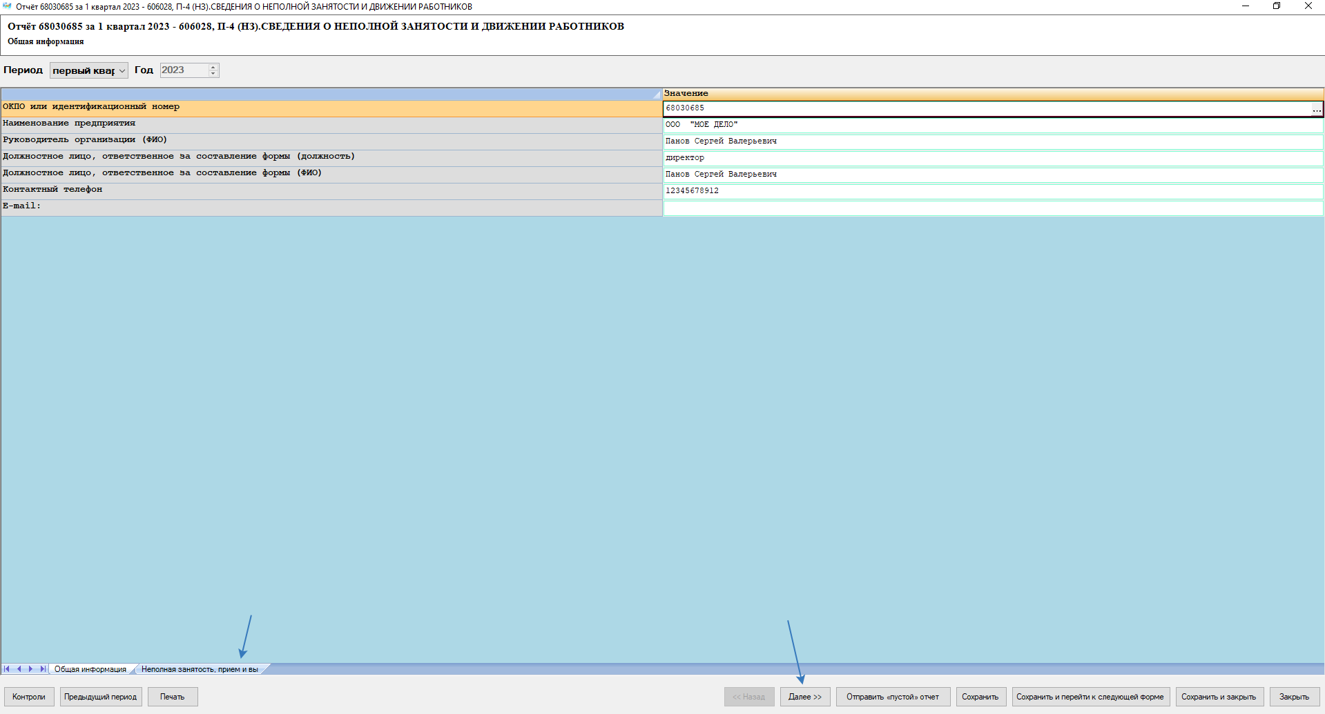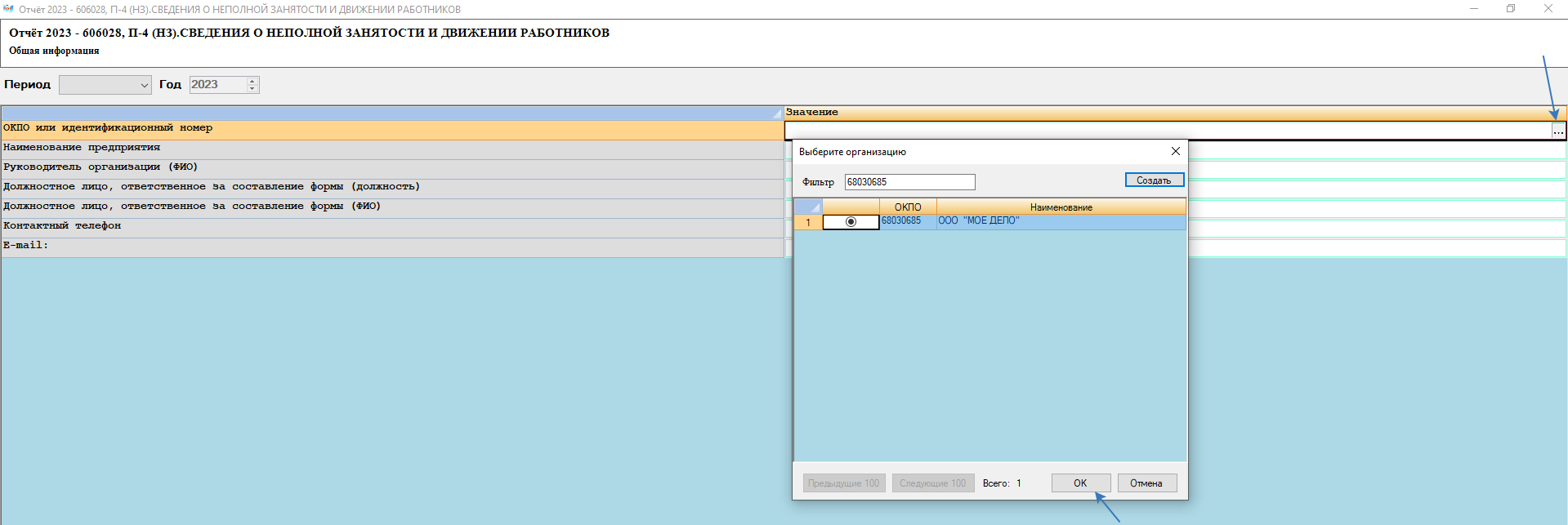 В верхней части окна можно выбрать отчётный период. В средней части окна расположены поля для заполнения отчёта. Некоторые поля заполняются с помощью справочника. Чтобы открыть справочник, нажмите на кнопку с тремя точками напротив строки кода ОКПО.