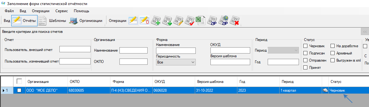 8. Нажмите «Закрыть». Отчёт отобразится в программе на вкладке «Отчёты» со статусом «Черновик»: