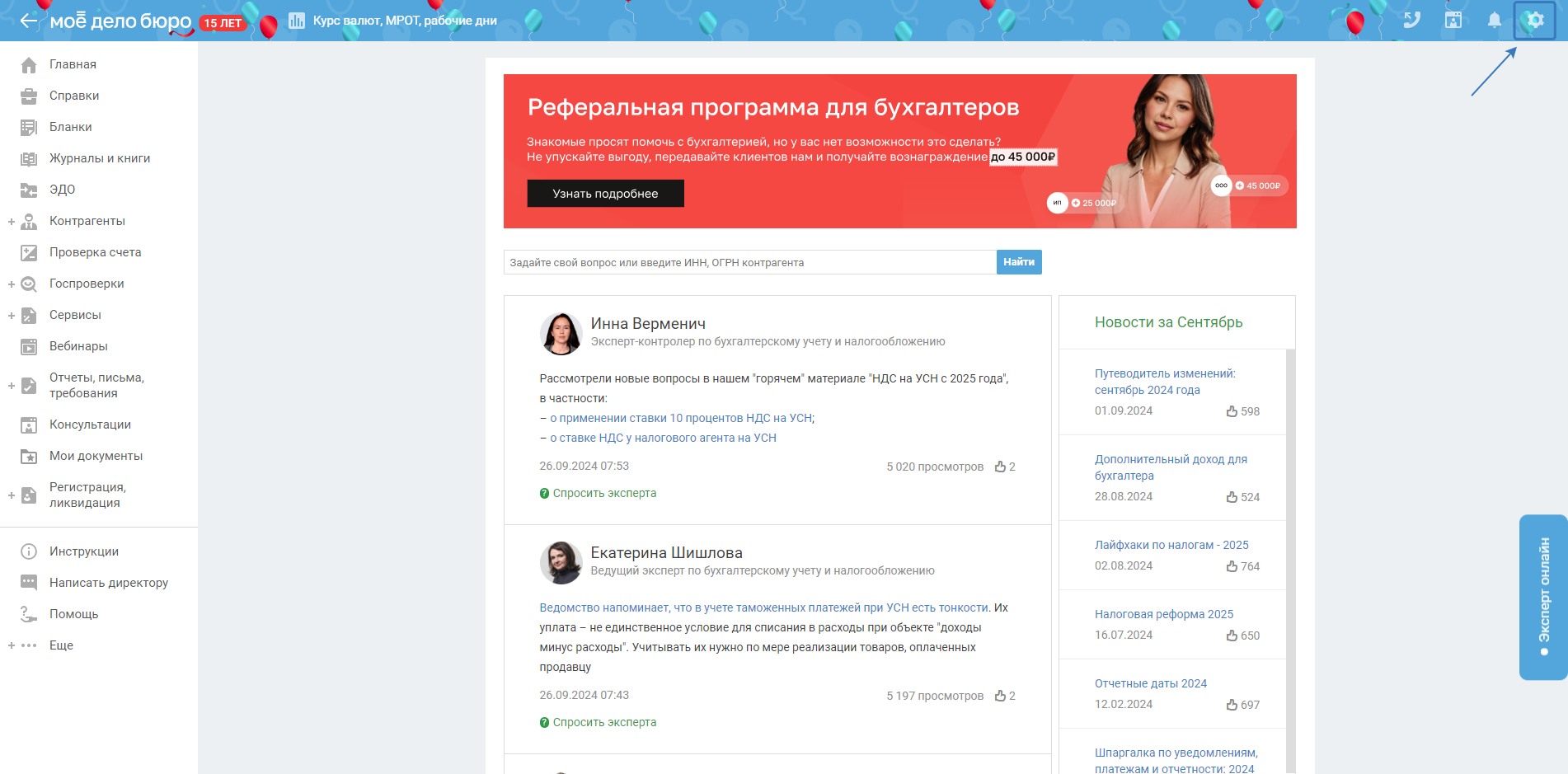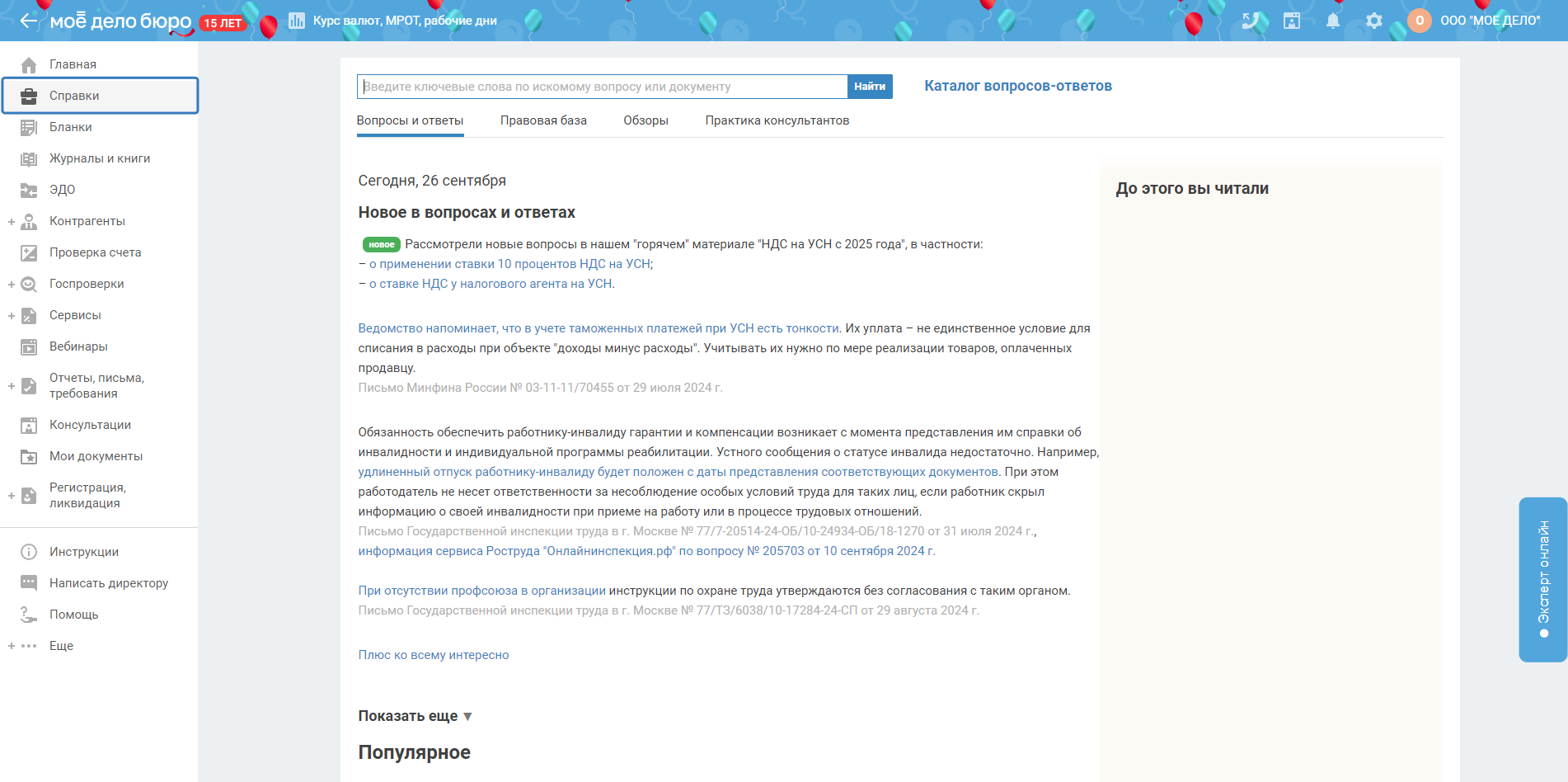 В разделе «Справки» вы найдёте информацию по налогам, бух. учёту, кадрам и праву: