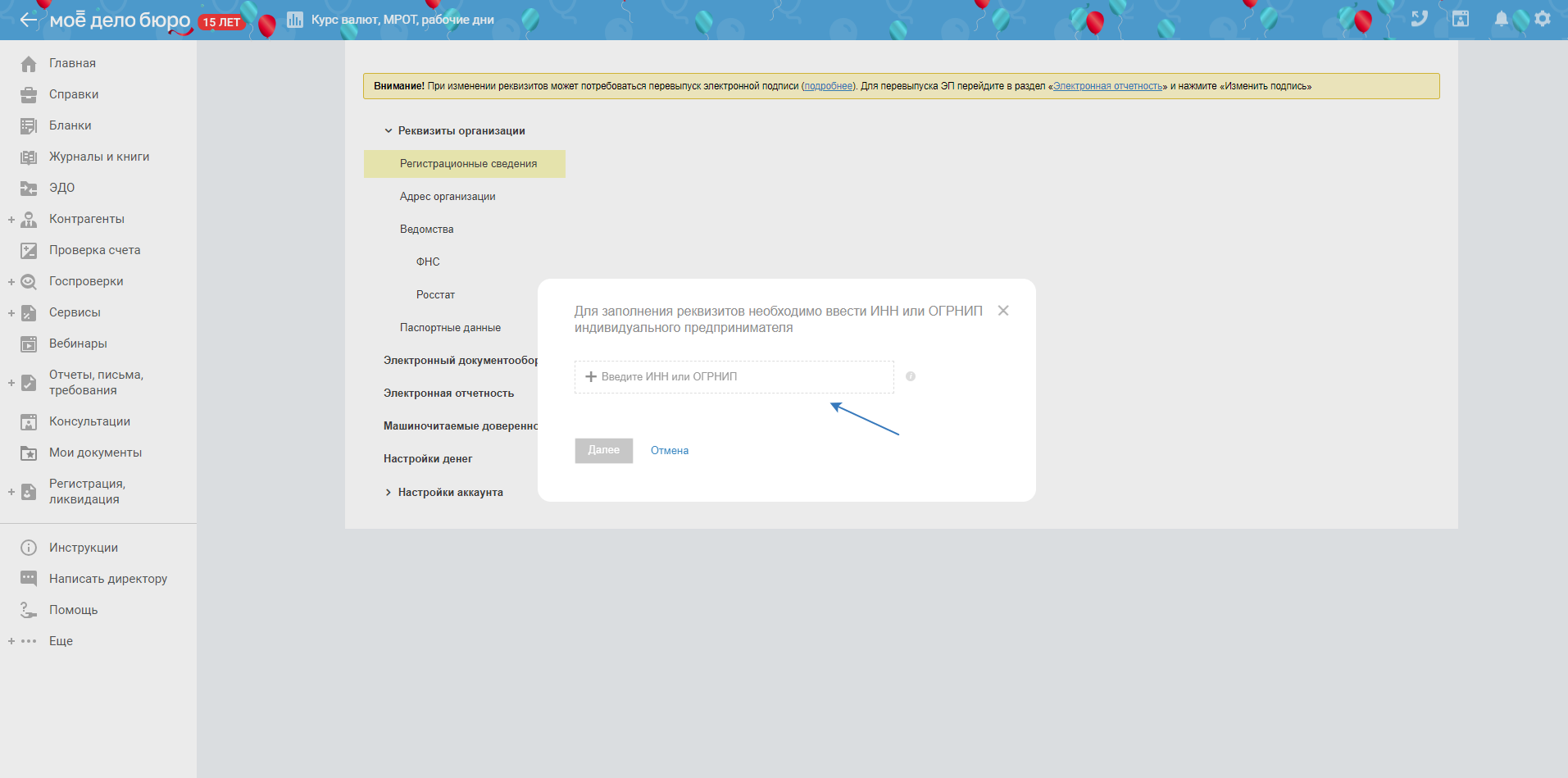 В открывшемся окне либо с помощью ссылки «Заполнить по ИНН или ОГРН» укажите ИНН: