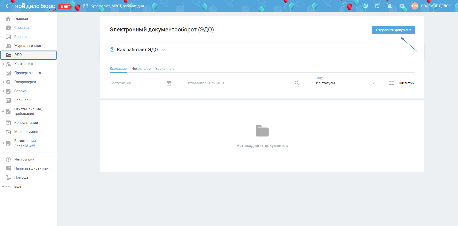 Раздел «ЭДО» можно рассматривать как электронный почтовый ящик для документов. Здесь видны все отправленные вами (вкладка «Исходящие») и полученные от контрагентов (вкладка «Входящие») документы, а также количество непрочитанных входящих документов: