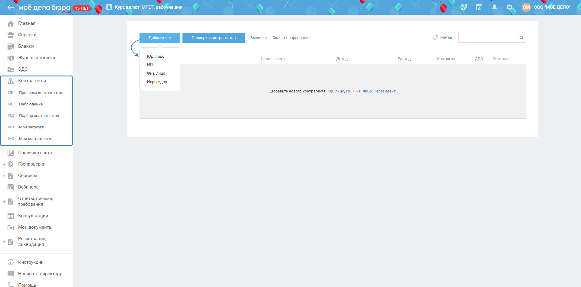 В разделе «Контрагенты» вы можете внести новых контрагентов, запросить по ним выписку из ЕГРЮЛ/ЕГРИП: