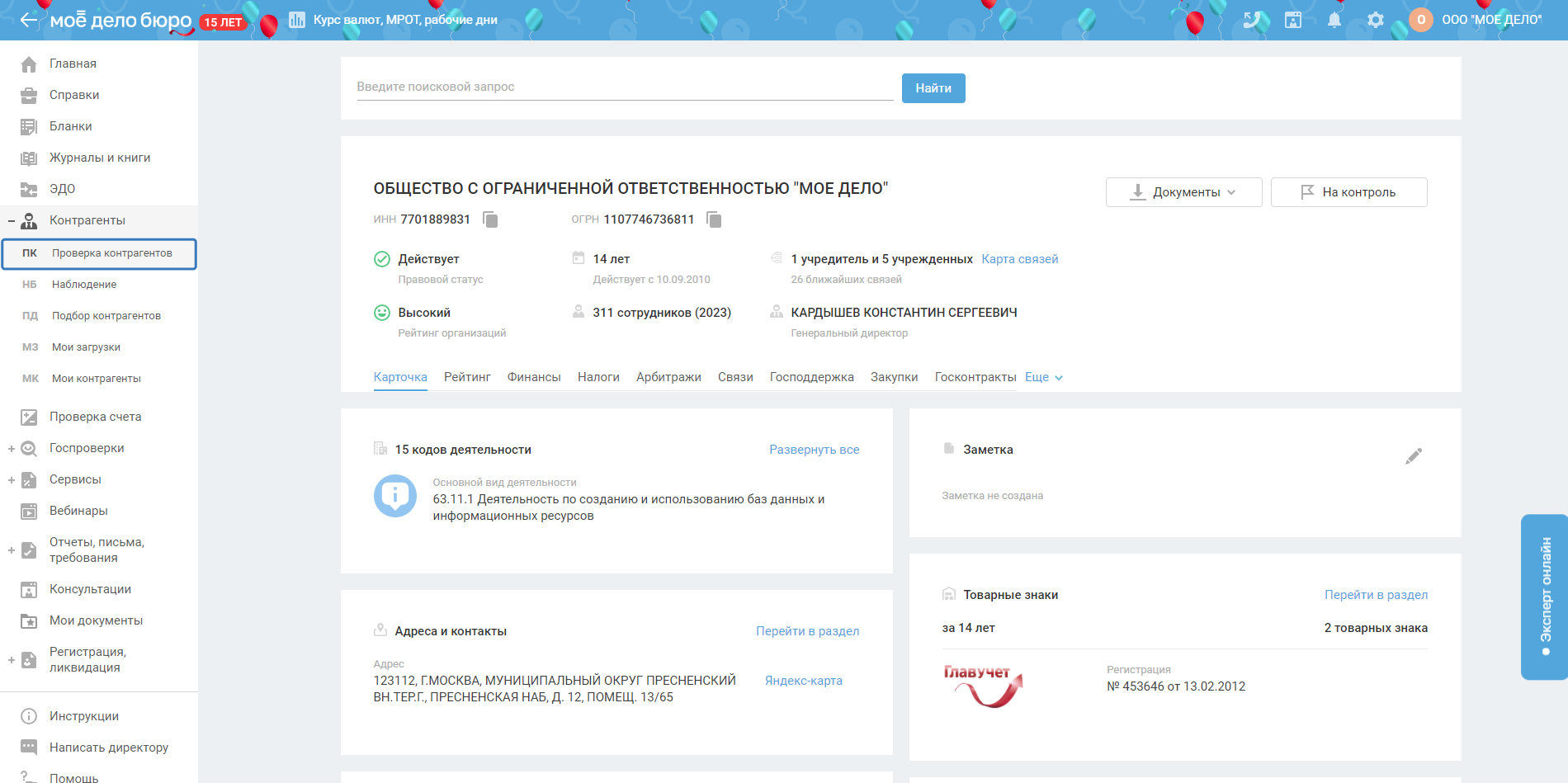 - предоставление детальной информации по различным данным контрагентов (регистрационные данные, арбитражные дела, отметки о попадании в негативные реестры ФНС, данные о закупках, госконтрактах, вакансиях, договорах залога и лизинга, госпроверках, товарные знаки, истории блокировки расчётных счетов и др);
