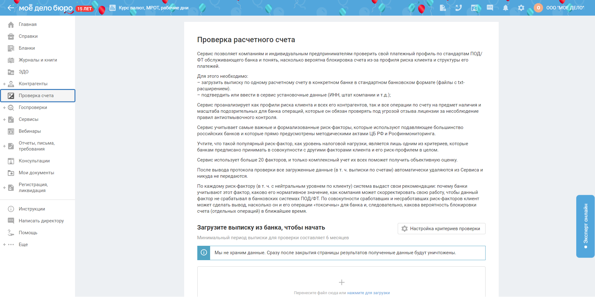 Сервис позволит вам проверить свой платёжный профиль по стандартам ПОД/ФТ обслуживающего банка и понять, насколько вероятна блокировка счёта из-за профиля риска клиента и структуры его платежей: