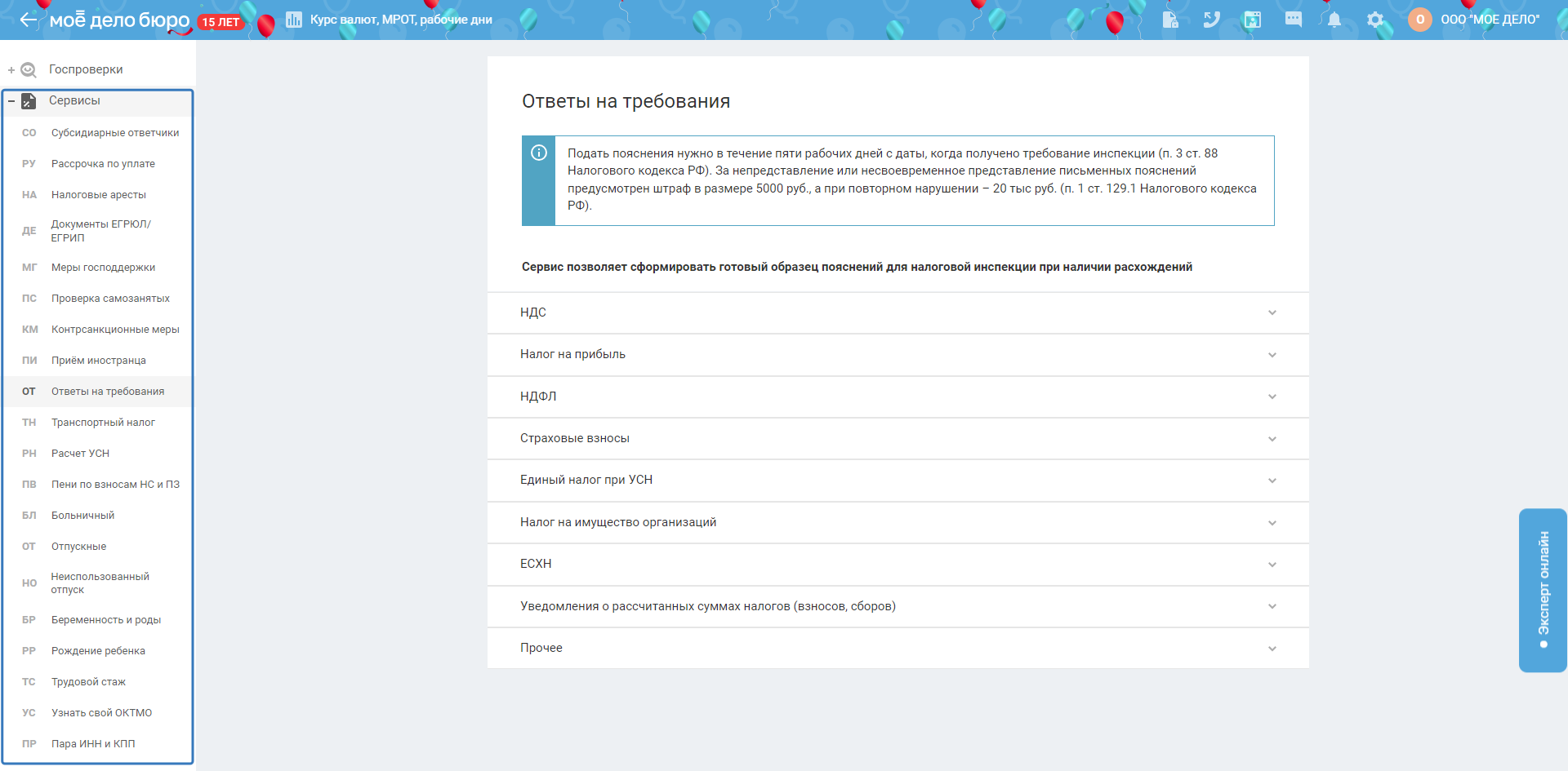 - множество сервисов, позволяющих рассчитать различные показатели, например, налог УСН или неиспользованный отпуск, сервисы-помощники в приеме иностранца на работу или расчёте рассрочки по уплате налогов и подобное;