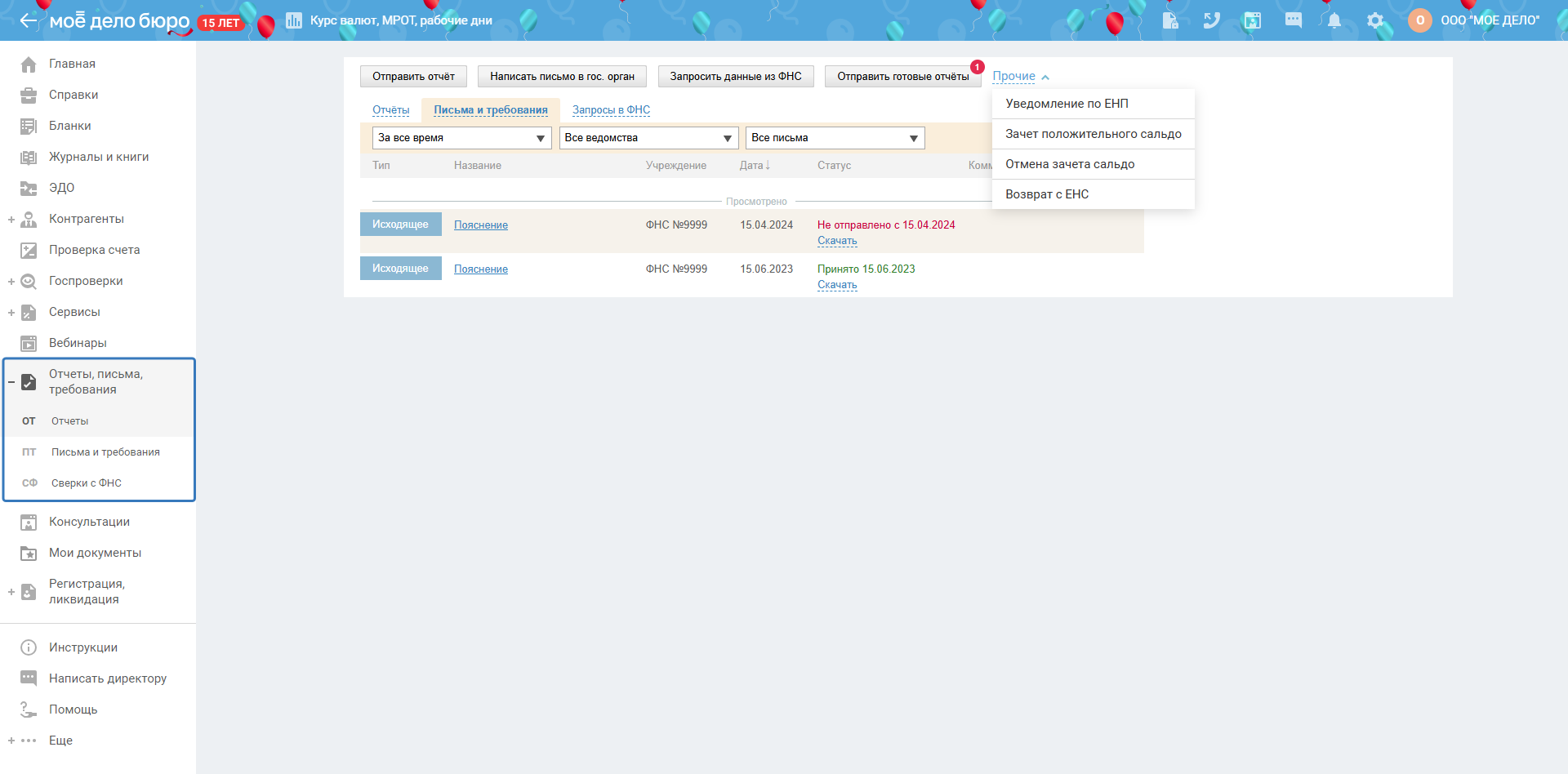 - сформировать и отправить заявление об отмене зачёта положительного сальдо;