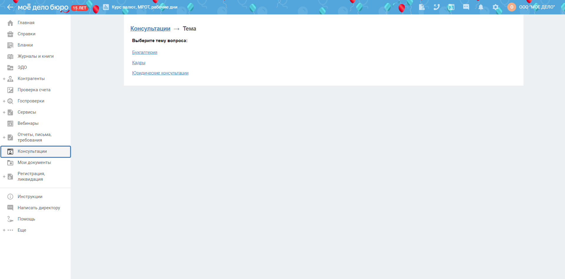 В зависимости от выбранного тарифа вам могут быть доступны консультации. Один из экспертов ответит на ваш вопрос о деятельности организации, хозяйственной ситуации, бухгалтерским проводкам, правилам расчётов налогов, взносов, кадровым и правовым процедурам.