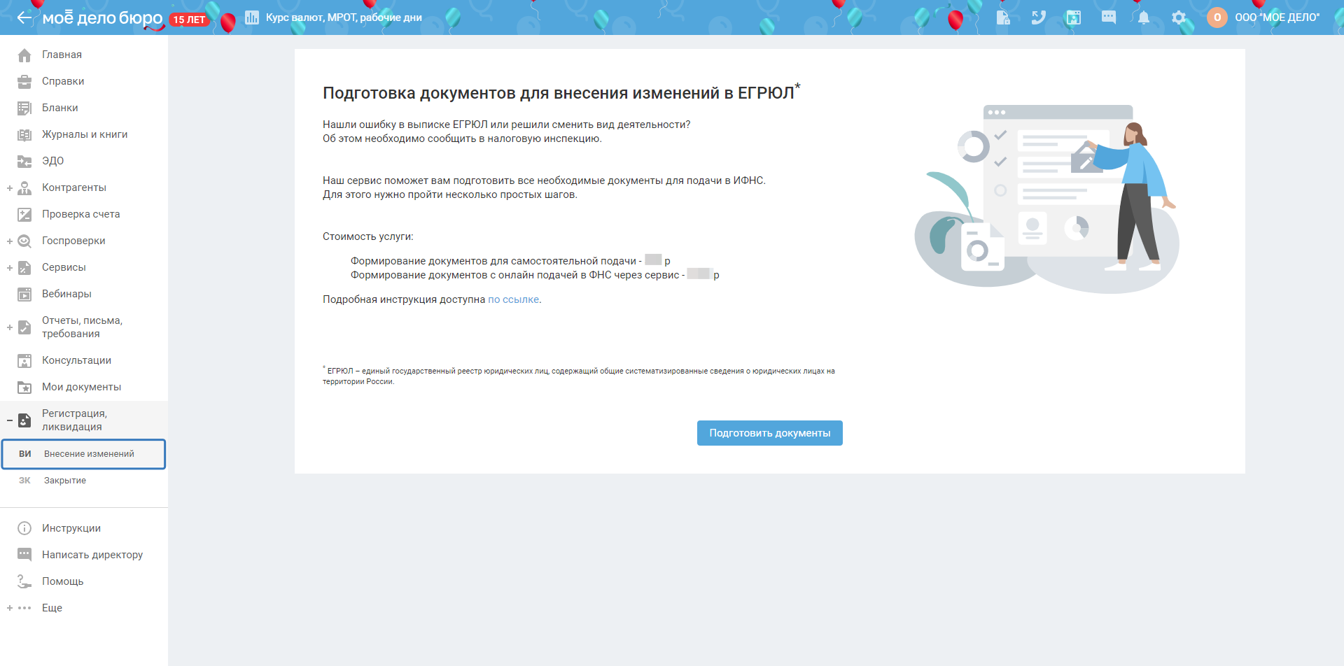 В личном кабинете вы можете сформировать и подать документы на внесение изменений в ЕГРИП/ЕГРЮЛ: