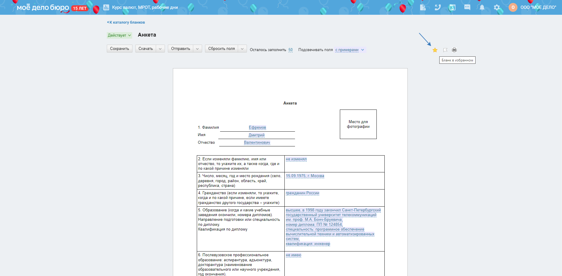 Некоторые типы бланков доступны для заполнения непосредственно в сервисе (на экране отмечены поля обязательные для заполнения), а некоторые можно только скачать и заполнить уже вручную.