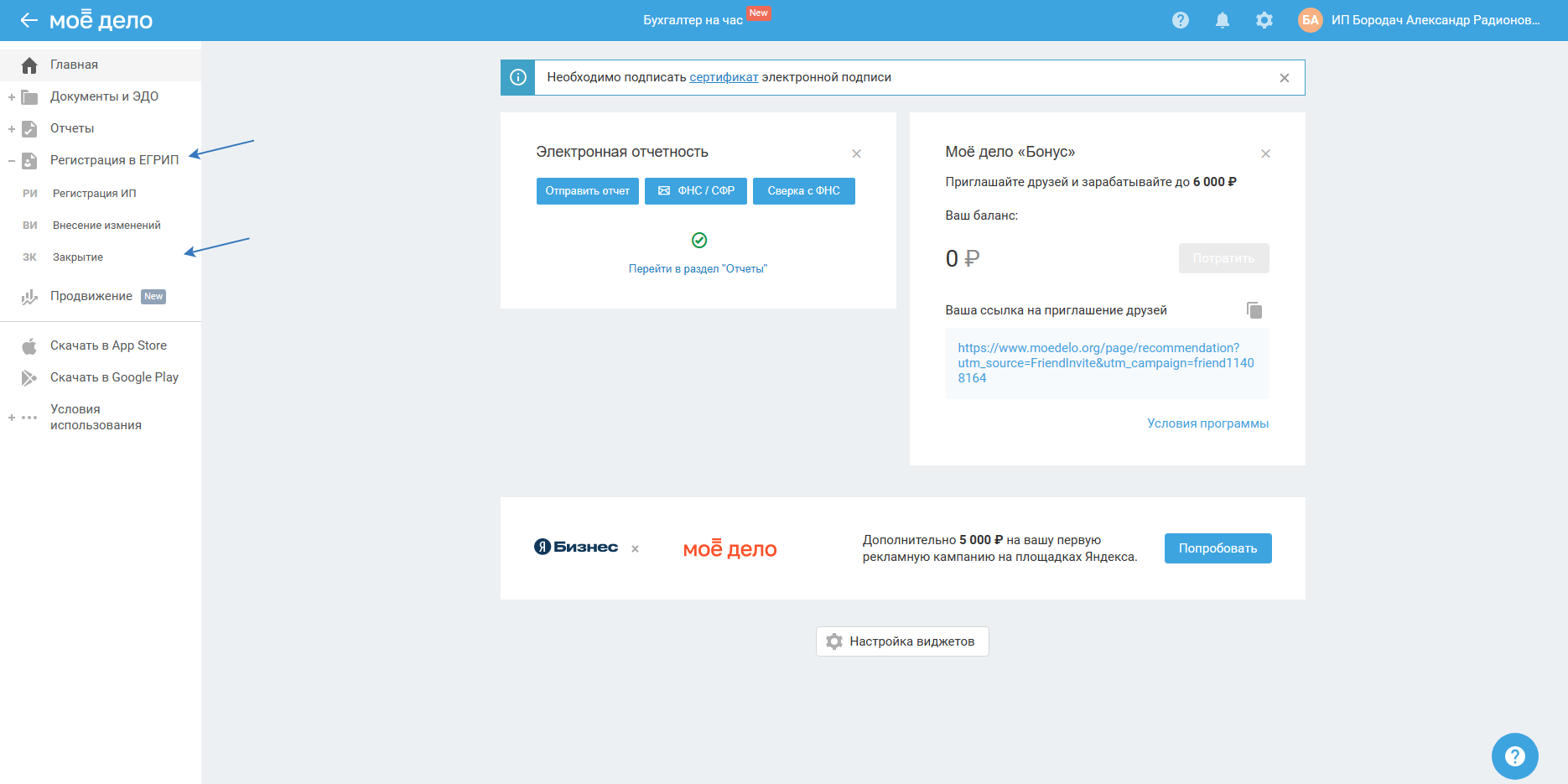 Для прохождения Мастера закрытия ИП пройдите на главную страницу личного кабинета и выберите «Регистрация в ЕГРИП — Закрытие»: