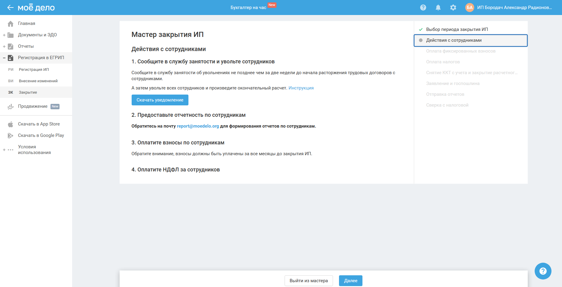 Если в реквизитах выделено «Я работодатель», то мастер покажет шаги с учётом шагов по сотрудникам: