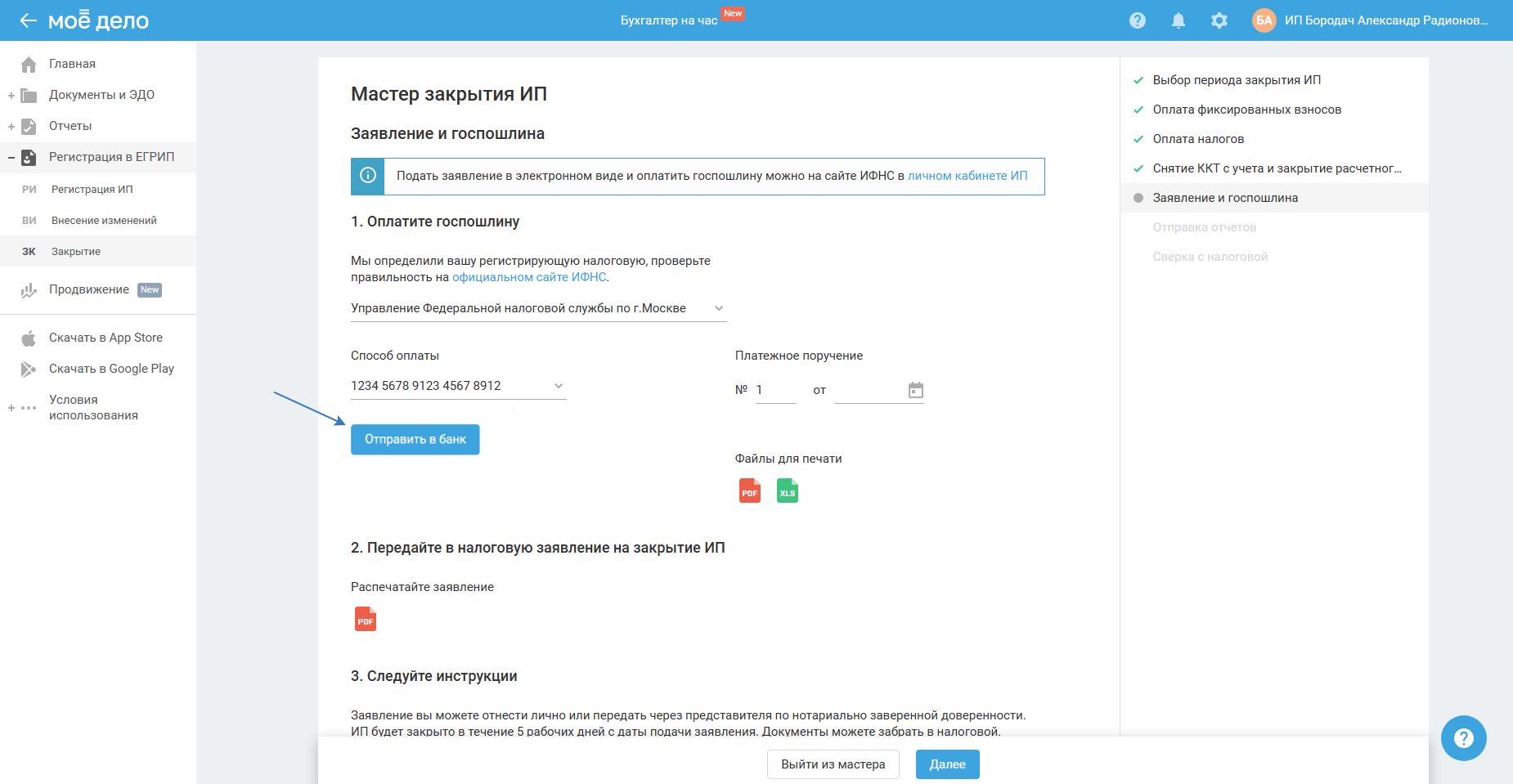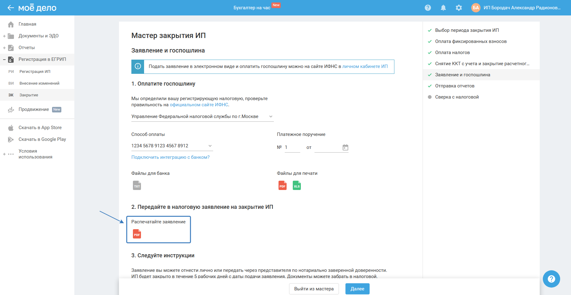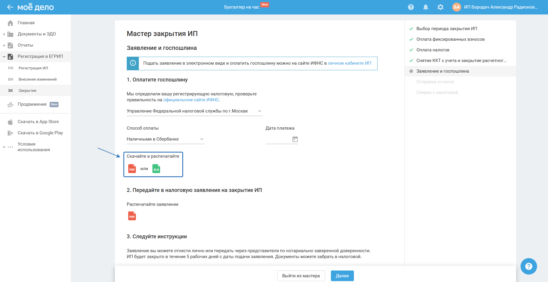 После оплаты взносов вернитесь в мастер закрытия ИП и нажмите «Далее».