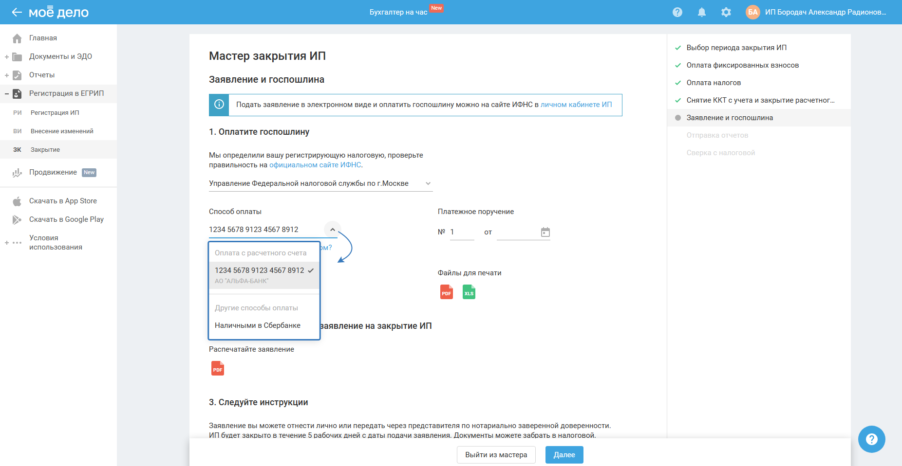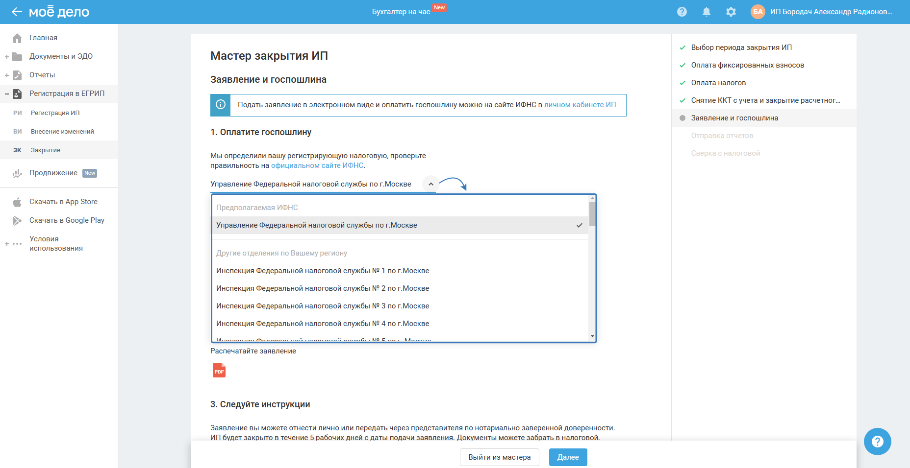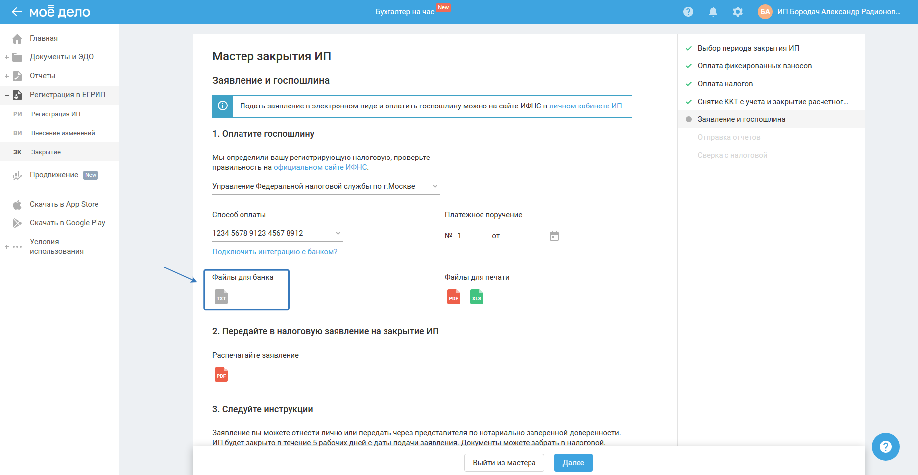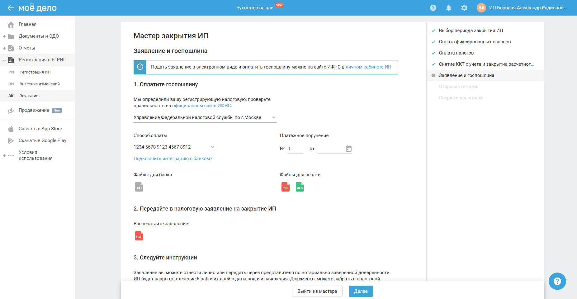 После оплаты взносов вернитесь в мастер закрытия ИП и нажмите «Далее».