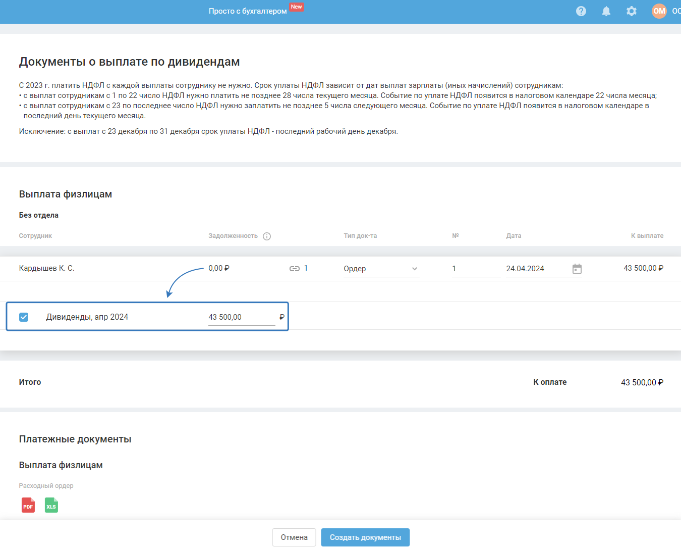 Для выплаты дивидендов перейдите на главную страницу и в блоке «Выплаты физ. лицам» выберите событие с названием «Выплата дивидендов»: