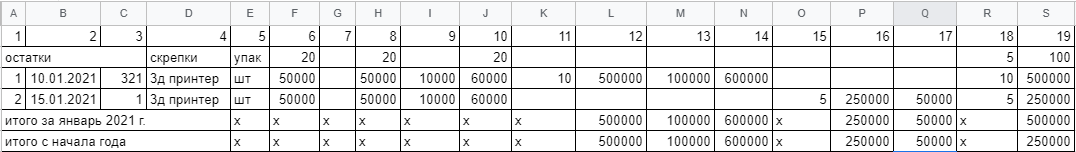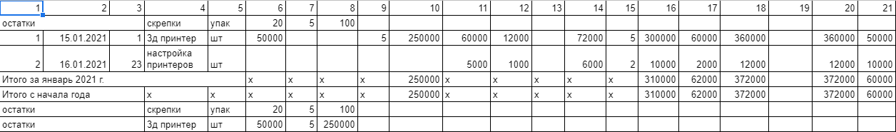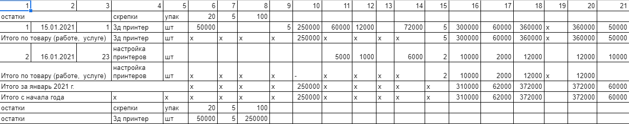 В данную таблицу попадают данные по покупке товаров/сырья, списанию их себестоимости, а также остатки на начало года.
