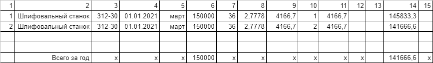 Для заполнения таблицы рассмотрим пример: 01/01/2021 было приобретено ОС Шлифовальный станок стоимостью 180000 в т.ч НДС 20% (30000). СПИ = 36 месяцев, ОКОФ 312-30. 31/01/2021 была заполнена ИК и 01/02/2021 ОС было запущено в эксплуатацию.
