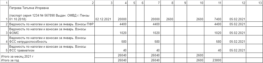 Сотруднику Петровой была начислена заработная плата за январь в размере 20000 рублей 02.12.2021.
