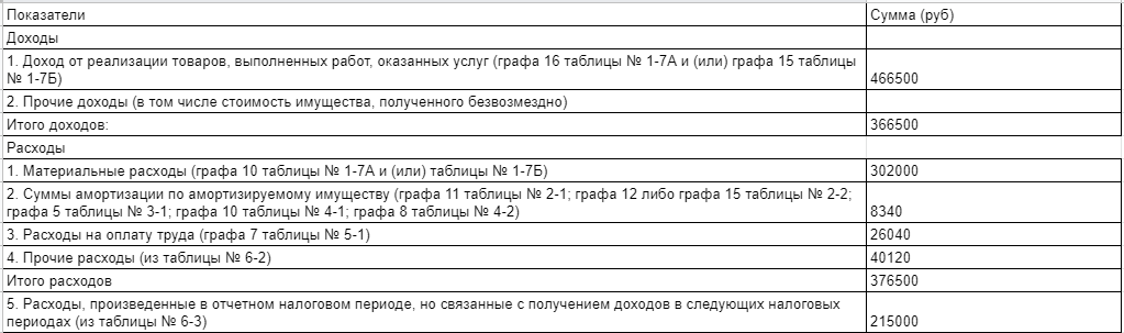 В нее вносятся доходы от реализации, указанные в таблице № 1-7А и прочие доходы (в том числе, полученные безвозмездно). В расходы попадают данные из таблиц № 1-7А (материальные расходы), таблицы № 2-1 (расчет амортизации основных средств), таблицы № 5 (расходы на оплату труда), таблицы № 6-2 (прочие расходы).
