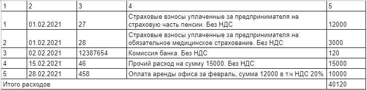 В таблице 6.2 указываются прочие расходы, которые не были включены не в одну из таблиц ранее: страховые взносы ИП за себя, расходы на приобретение услуг, комиссия банка командировочные расходы и т.д.