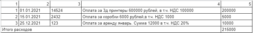 - 10.01.2021 был получен и полностью оплачен товар 3д принтер в количестве 10 штук на сумму 600 000 рублей в т.ч. НДС 20%. УПД № 324.