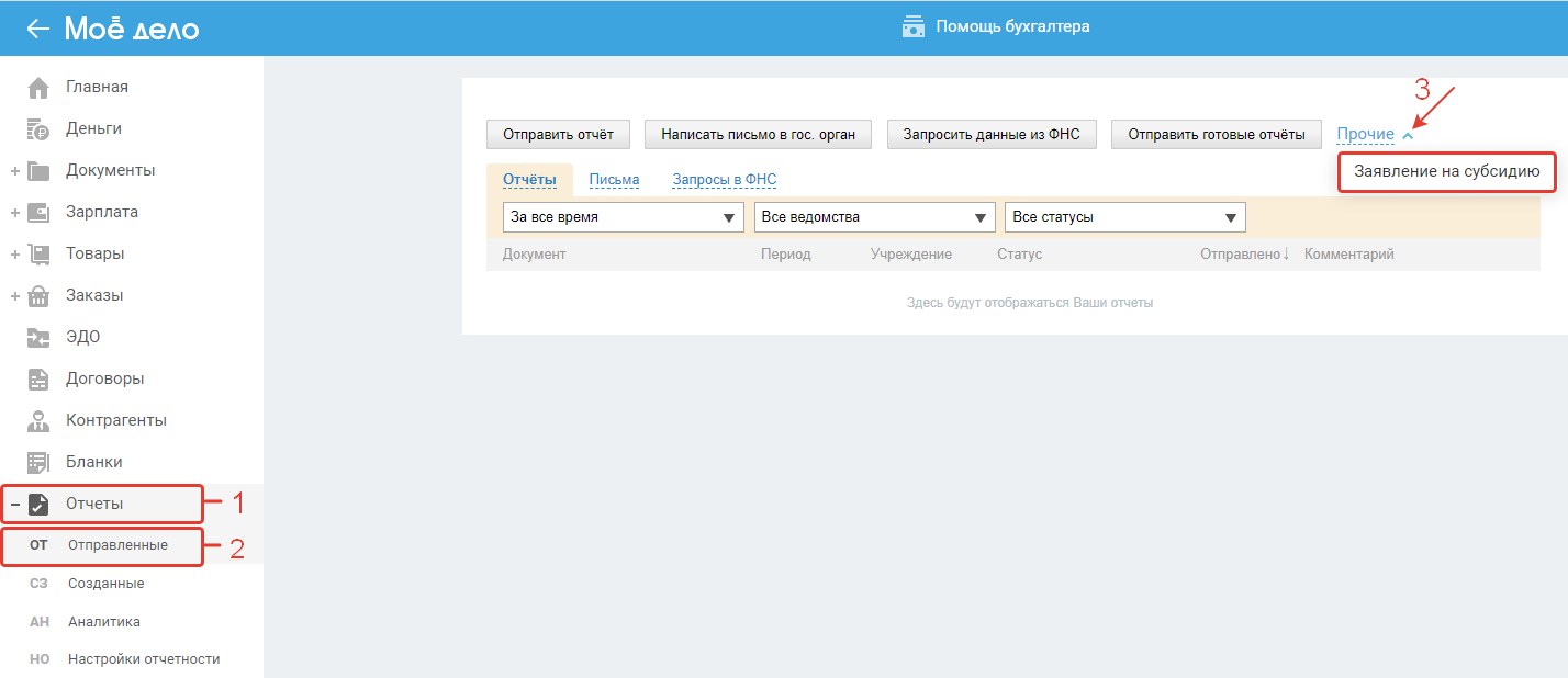Для формирования отчета перейдите в раздел «Отчёты» - «Отправленные», нажмите кнопку «Прочие» и выберите из выпадающего списка «Заявление на субсидию».